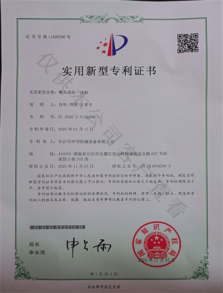 餐具清洗一体机-专利证书